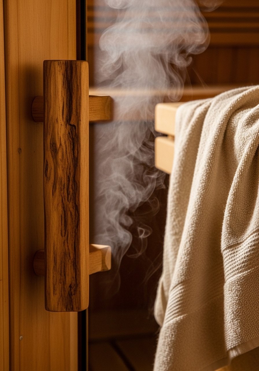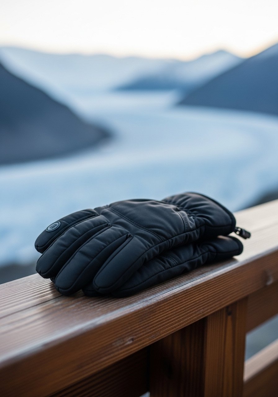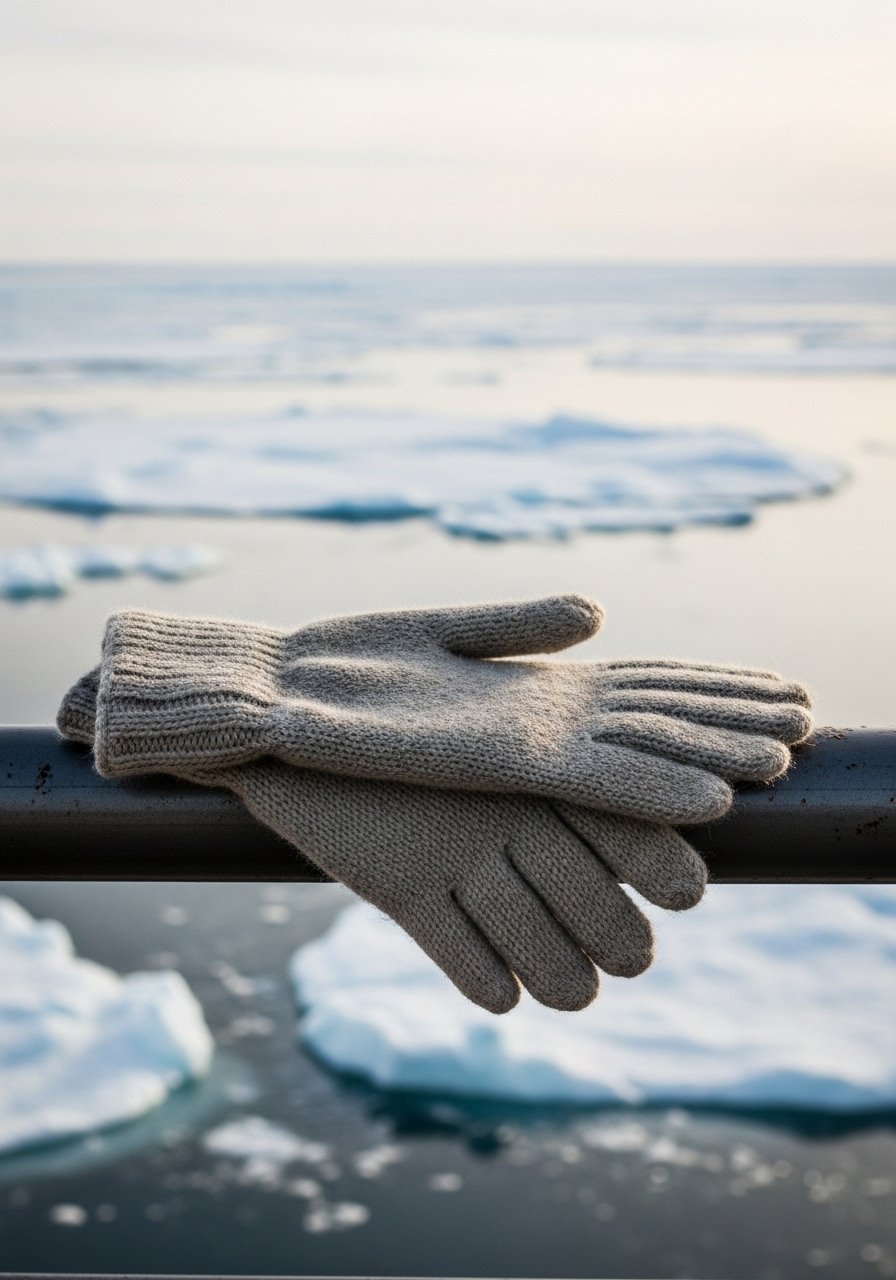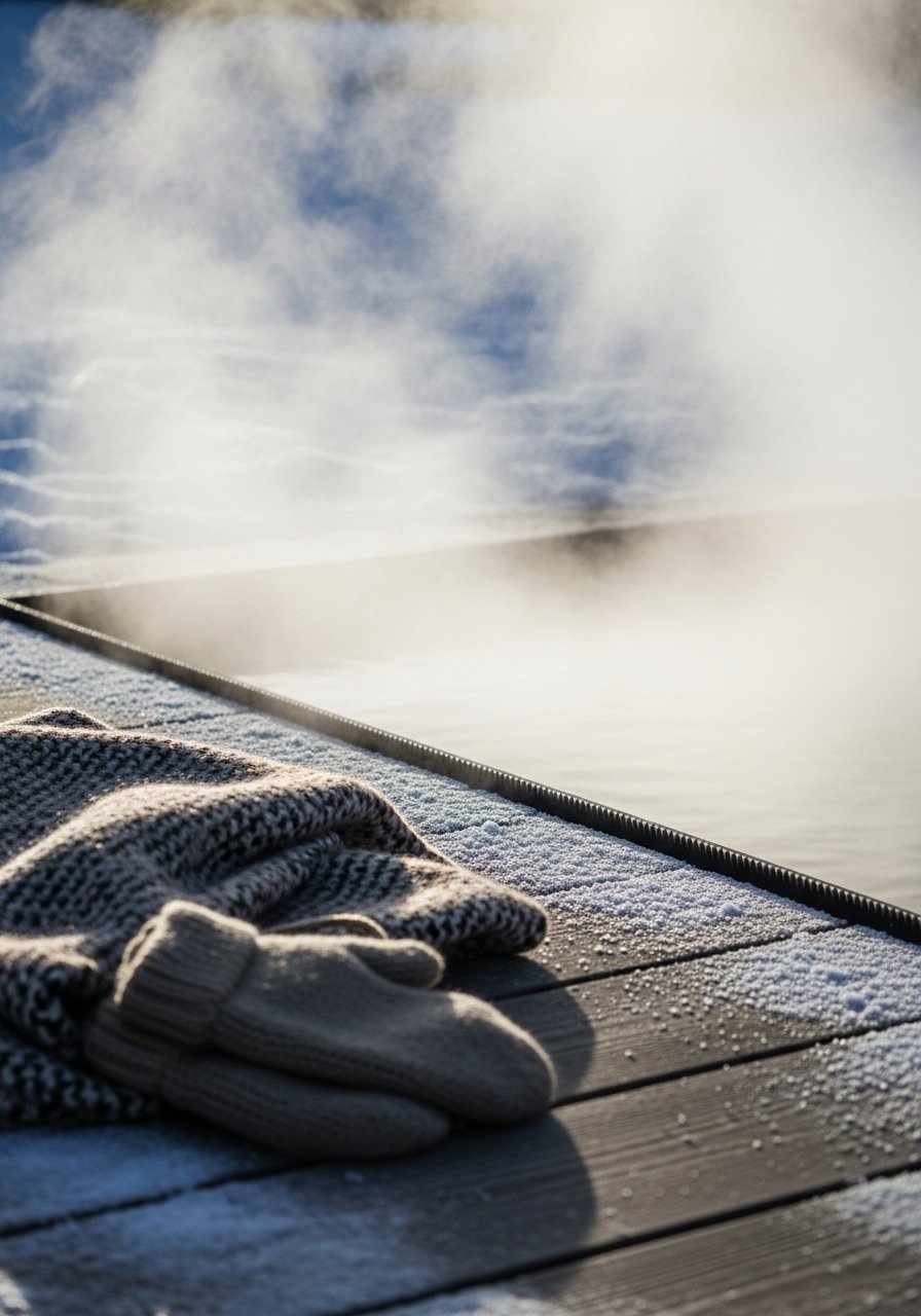 [Image Prompt: Close-up of wool mittens on a wooden hot tub edge with steam rising and dark sky beyond. Early night glow.